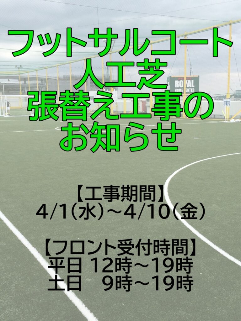 下記日程にてフットサルコートの人工芝張替え工事を行います。